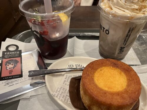 プロント×スパイファミリー 前回、コナンくんコラボの時に行ったプロントが美味しいけど高くて…コラボ商品が。今回、行くの迷ったけど、お昼食べてないのでお茶してきた。 コラボドリンクのヨルさんのサングリア。コースターは…見たらそれもヨルさんだった。…